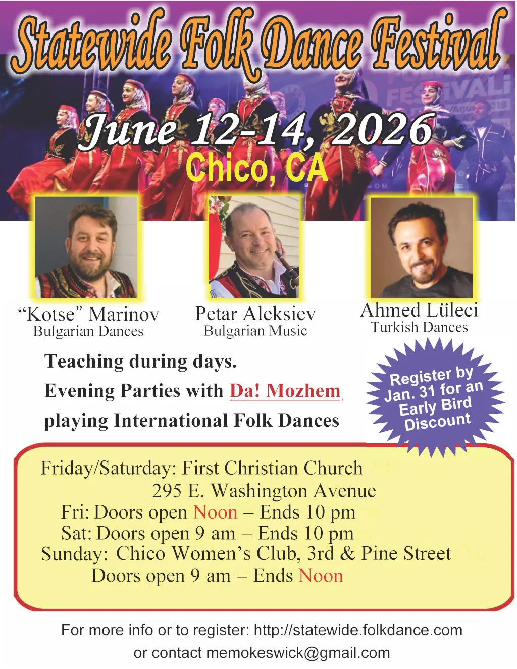 For more information or to register, https://www.folkdance.com/event/statewide-2026/ (After June 6 pay at the door.)